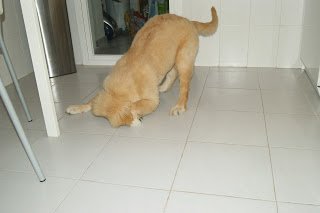 Elkezdtük hát tüzetesebben vizsgálgatni kedvencünk reakcióit, hátha meglátjuk a fényt… és lőn. A kritikus vizslatásnak kitett jószágon tisztán látszott, hogy első blikkre minden parancsnak eleget akar tenni. Vagyis nem hülyült el az éjjel, bármennyire is igyekszik ezt elhitetni velünk. A kiadott utasitásra megrándult a lába, elindult lefele a popsija, azaz, a teste igyekezett volna eleget tenni a kérésnek. De a makacs eb megemberelte magát (oké-oké, ez nem teljesen pontos, de az meg annyira hülyén hangzik, hogy megkutyálta magát…), szóval mindent megtett az ellenállás érdekében, sikerrel. Már csak azt kellett kideritenünk, hogy mi a franc baja van, hiszen arról meggyőződtünk, hogy komédiázik.